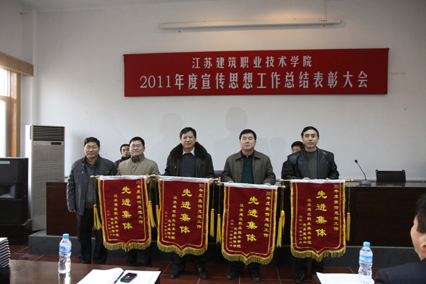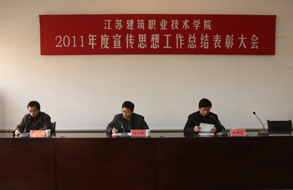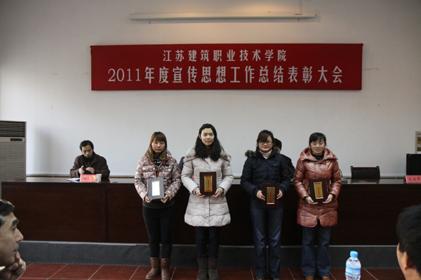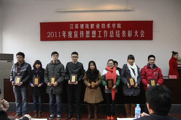 宣传部副部长孙伟作了2011年度宣传思想工作总结报告。宣传部部长方桐清宣读了2011届大学生记者团、广播台、四维网成员聘任文件和2011年度宣传思想工作表彰决定。建管学院党总支、设计学院党总支、装饰学院党总支、教务党总支等4个单位被评为“2011年度宣传思想工作先进集体”,张雪梅等5位教师被评为“优秀特约通讯员”,刘扬等8名学生被评为“优秀学生记者”。沈士德副院长为获奖单位和个人分别颁发了锦旗和证书。