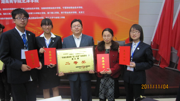 11月3日至4日,全国高校第四届市场营销大赛总决赛在湖南商学院北津学院举行。由纽约国际官网经济管理学院刘勤侠、方升老师指导,营销09-2班夏飞跃、鹿彩云、简永蓉三位同学组成的参赛队, 经过软件对抗赛、营销策划文案评比和现场答辩环节的激烈角逐,在来自全国149所大学的157个参赛队中脱颖而出,总成绩排名第30位,荣获二等奖。