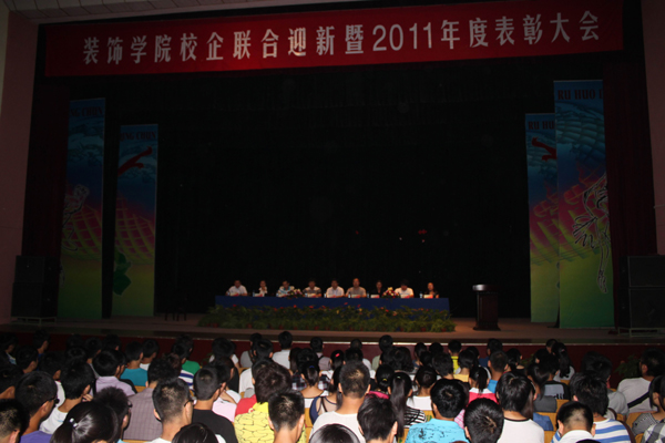建筑装饰艺术学院精心选择在2011级新生入学之际,与企业联合开展迎新活动,在新生入学教育中极力融入企业、行业的元素,受到了装饰学子的热烈欢迎。会上,装饰学院孙亚峰院长首先发表了热情洋溢的讲话,对2011级新生表示热烈地欢迎,并对装饰学院一年来的校企合作情况作了全面的回顾与总结。上海睿合广告传播有限公司、徐州清大吉博力建材有限公司、江苏水立方建筑装饰设计院、徐州天力建筑装饰工程公司4家企业表彰了2010年度企业奖学金获得者并颁发了荣誉证书与奖学金。副院长沈士德和学院党总支书记黄立营共同为在学业、技能、服务、文体等方面表现突出的“艺术之星”颁奖。最后,徐州天力建筑装饰工程公司总经理李宝珠为全体学生作了《艺术人生·名师讲坛》专题讲座。