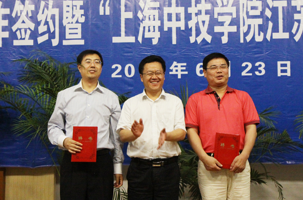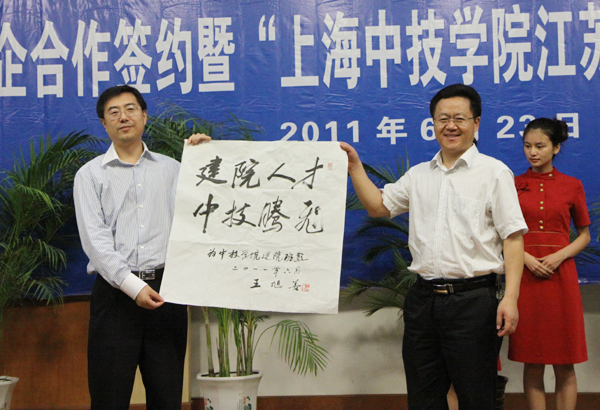 在欢快的音乐声中,袁洪志院长与朱建舟总裁共同为“上海中技学院江苏分院”揭牌,向朱建舟、胡蕊两位企业总裁颁发“客座教授”聘书,并代表校党委书记王旭善为本次揭牌仪式赠送题词。张登宏副院长与朱建舟总裁代表校企双方举行了校企合作签约仪式。