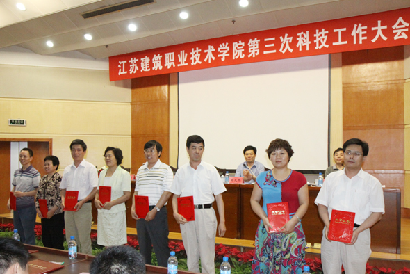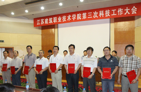 建筑工程学院、建筑设备工程学院等6个二级学院、科研机构被评为先进集体,张宝军、王军强等22名教师被评为先进个人,《装饰型外墙保温系统开发与应用研究》(主持人:季翔)、《钢结构住宅造价研究与应用》(主持人:陶红林)等10个项目荣获优秀科技成果奖,《并联装置中调速水泵台数的确定及运行管理》(作者:刘家春)、《徐州城市色彩规划设计与管理研究》(作者:季翔)等22篇论文荣获优秀科技论文奖。先进集体、先进个人、优秀科技成果代表、优秀论文作者依次上台领奖后,市政工程学院院长王国平、建筑工程学院教师王军强分别代表先进集体和先进个人作大会交流发言。