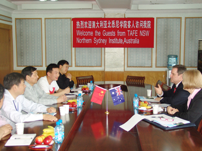 5月19日,我院友好伙伴学校——澳大利亚新南威尔士州北悉尼技术与继续教育学院(TAFE NSW Northern Sydney Institute)国际商务部部长、商业和贸易系主任兼Crows Nest分院院长Steve McManus(史蒂夫·麦克曼拿斯)先生和国际商务部经理Virginia Williams(维吉尼亚·威廉姆斯)女士访问我院,院党委书记王旭善、副院长张登宏会见了澳大利亚客人。王旭善对客人的远道而来表示热烈欢迎,张登宏向客人着重介绍了我院的历史沿革、办学特色,特别对中澳班的教学情况做了详细介绍。麦克曼拿斯先生首先表达了对我国四川地震灾区遇难同胞的哀悼和同情,并对我院的热情接待表示感谢。之后双方对合作办学中存在的问题交换了意见,进行了坦诚沟通。国际合作交流中心、经济管理系相关人员参与了会见。
