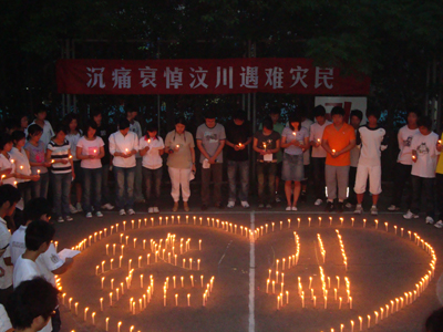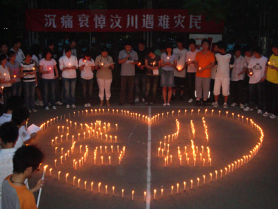 5月21日晚,我院师生情系灾区,沉痛哀悼在汶川地震中遇难的同胞,并纷纷开展为灾区祈福活动。矿建系学生怀着沉痛的心情在东校区篮球场上用蜡烛拼成了心的图形和汶川加油的字样。学生代表激动地发言,同学们从心里喊出了汶川加油、四川加油、中国加油的口号,并用歌声为灾区人民祈福,希望死者安息,生者坚强。
