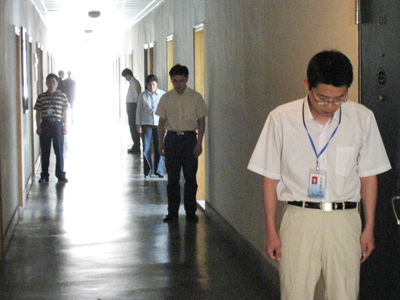 机关、各系(院)教职员工在办公室的走廊上肃立默哀。上课的师生在教室内肃立默哀。
