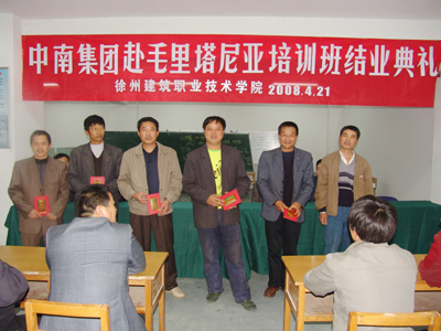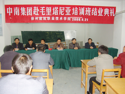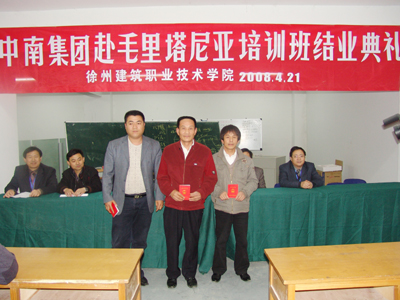 袁洪志在典礼上发表讲话,培训班班主任陈年和作培训工作总结发言、中南集团学员高四化作学习汇报发言,校企合作办公室主任许能生主持了典礼。院长袁洪志、副院长张登宏为六名优秀学员颁发了荣誉证书,为全体培训合格学员颁发了技能高级证书。为期一周的中南集团赴毛里塔尼亚工作人员培训工作圆满结束。