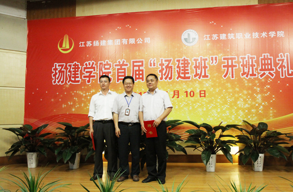 袁洪志向扬建集团宋晓军等8名企业技术骨干颁发兼职教授聘书。季翔代表学校向“扬建班”的开班表示祝贺,向支持学校建设与发展的扬建集团表示感谢,并表示,江苏建院将以最大的努力和诚意全面践行合作约定,通过学校和企业共同努力,一定能不断优化学校的育人体系,培养出适合建筑行业、企业的高素质技能型人才。季翔还对首届扬建班提出具体的希望和要求,他希望同学们珍惜机会,转换角色,尽快融入扬建文化中,要求同学们遵守承诺,勤学苦练,以优秀成绩回报企业。