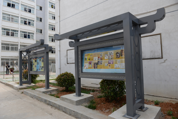 宣传栏材料使用不锈钢塑形,外观颜色灰色,运用民族传统建筑斗拱文化、回纹文化、徐州地域性的汉文化像石独特的图形为蓝本,通过建筑的“形”与“意”归纳设计,使整体造型装饰语言与现代高校服务设施相结合,体现民族性,简洁有趣实用,结构舒展形式感强,展示了楚汉文化风韵,彰显了传统建筑特色,为学校宿舍区增添了新的文化阵地。(网宣)
