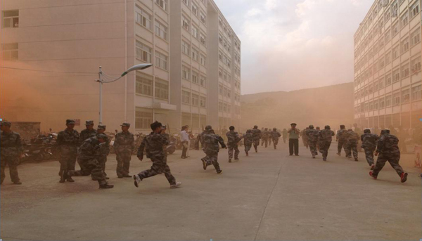 二是组织了应急避险疏散演练活动。演练时,各学生新生宿舍楼按照演练方案进行演习,学校有关职能部门负责人、二级学院领导和演习指导组成员按预定的程序指导学生进行认真演练。演习令下达后,演习警报拉响,工作人员点燃事先准备好的模拟烟雾弹,有关参加演习的楼宇随即冒起桔黄色的浓烟。与此同时,各宿管员迅速启动消防应急疏散门,声光报警和指示系统也同步响起,各宿舍学生迅速反应,引导员引导学生有序疏散,并不时提醒楼道中同学们低头弯腰,湿毛巾捂住口鼻,防止吸入浓烟。同学们按照指引迅速地沿安全通道撤离疏散到户外安全位置。