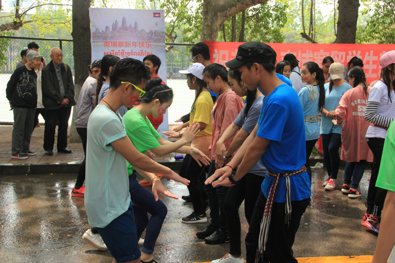 上午10点,留学生们身着统一T恤衫,伴随着东南亚传统音乐,载歌载舞,互相泼水祝福。现场热闹的气氛和留学生们的特色舞蹈吸引了过往师生驻足观看,并被欢快的气氛感染,很多同学更是主动加入了泼水活动中,共同体验了一把异国风情。