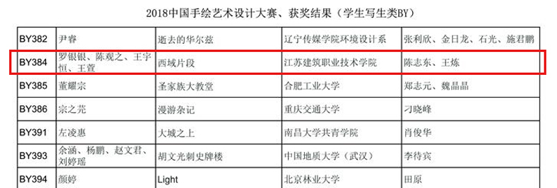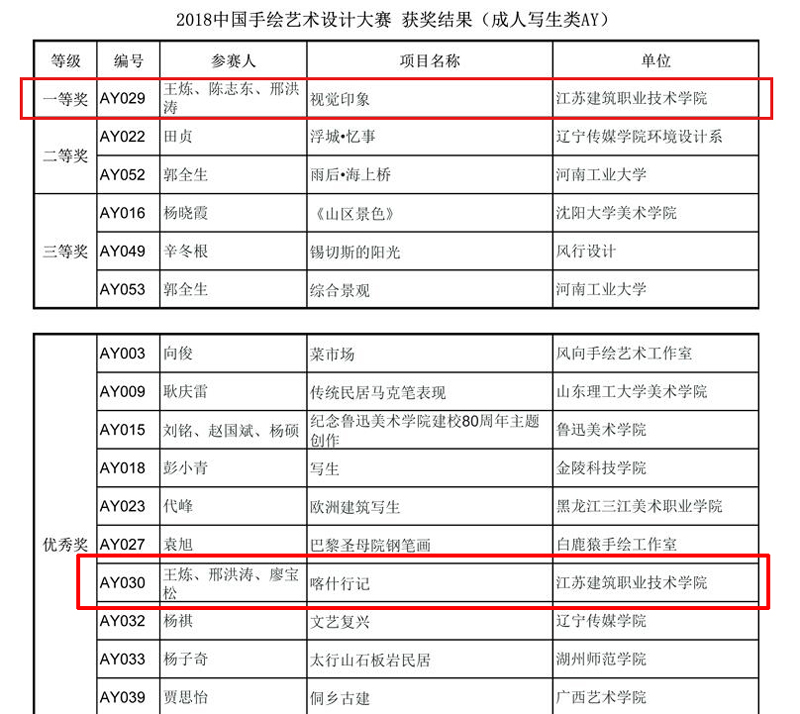 近日,第十五届中国手绘艺术设计大赛评审工作在京圆满结束。纽约国际官网建筑装饰学院手绘表现教学团队王炼、陈志东、邢洪涛作品《视觉印象》获专业组写生类一等奖,纽约国际官网是该赛事举办以来获此奖项的唯一高职学院。王炼、邢洪涛等作品《喀什行记》获优秀奖,建筑装饰学院学生罗银银、陈观之、王宇恒、王萱作品《西域片段》获学生组优秀奖。