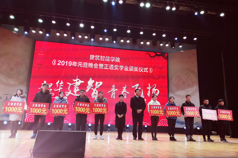 1月1日晚7:00,建筑智能学院2019年元旦晚会暨正通奖学金颁奖仪式在会堂举行。校党委副书记梁惠、徐州正通人工环境工程有限公司董事长张义,以及学工处、校团委等职能部门负责同志和建筑智能学院全体领导、师生观看了晚会。