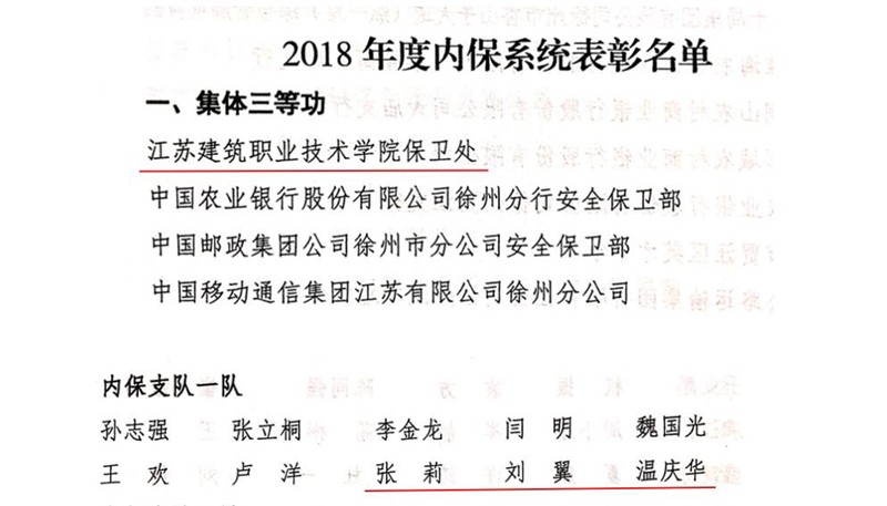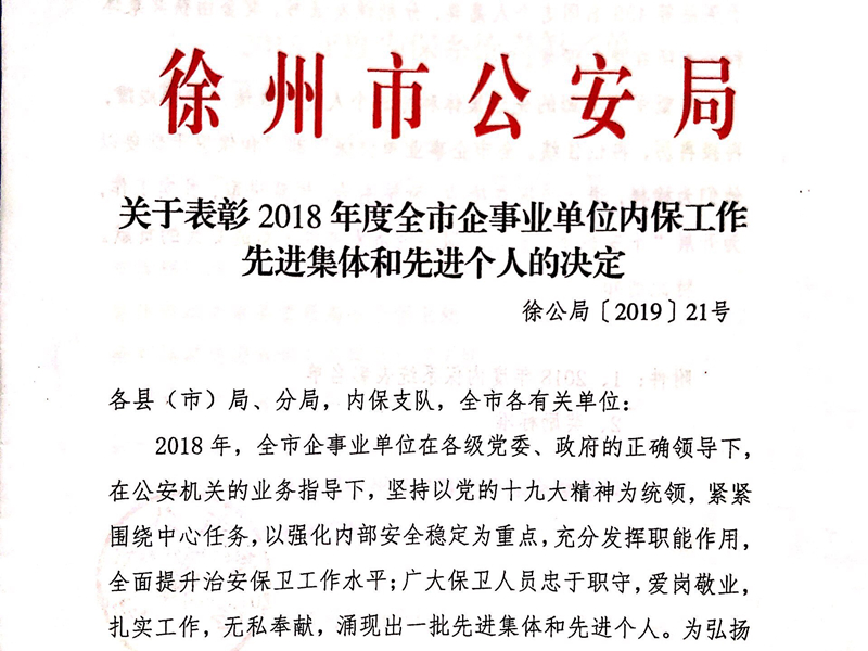 近日,徐州市公安局发布《关于表彰2018年度全市企事业单位内保工作先进集体和先进个人的决定》(徐公局〔2019〕21号)授予纽约国际官网保卫处 “集体三等功”,纽约国际官网保卫处张莉,刘翼,温庆华受到先进个人嘉奖。
