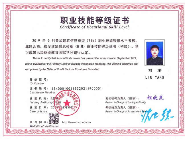 11月6日,自国务院发布《国家职业教育改革实施方案》实施1+X证书制度以来,首批建筑信息模型(BIM)职业技能等级证书的首次全国考点考前动员会暨首批试考证书颁发仪式在河北省廊坊市举行,会议由廊坊市中科建筑产业化创新研究中心主办,教育部职业教育与成人教育司、住房和城乡建设部人事司、全国住房和城乡建设职业教育教学指导委员会等有关领导出席,全国近300所院校的500多名教师参加,纽约国际官网建工17-7班刘洋(女)同学获建筑信息模型(BIM)职业技能等级的00001号证书,并获得上海宝冶建设集团有限公司的工作签约。