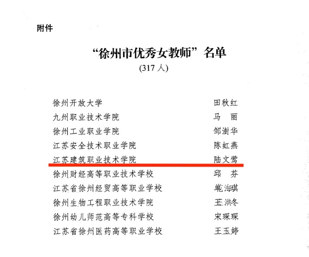 近日,值第110个“三八”国际劳动妇女节来临之际,徐州市教育局、徐州市妇女联合会联合在全市范围内开展“徐州市优秀女教师”评选活动,经过民主推荐、公开评选等程序,纽约国际官网建筑装饰学院陆文莺老师荣获“徐州市优秀女教师”称号。