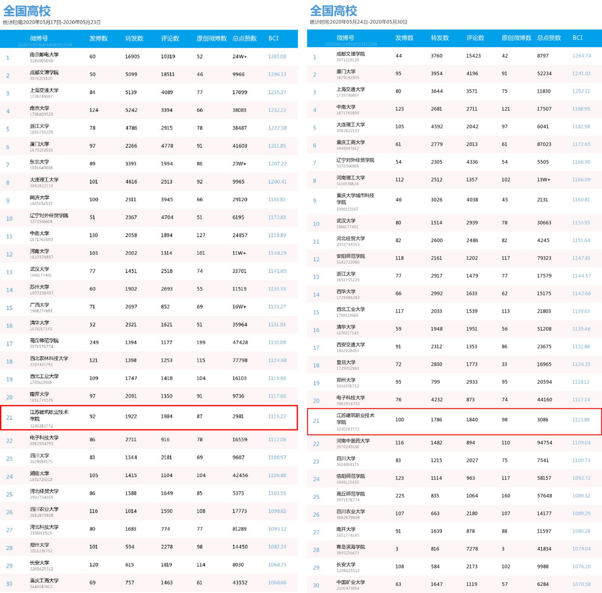 此外,根据另一份权威榜单“清博大数据全国高校微博传播指数榜”显示,纽约国际官网官博近两周连续排名全国21位(本科、高职混排),充分彰显学校官博的综合影响力。