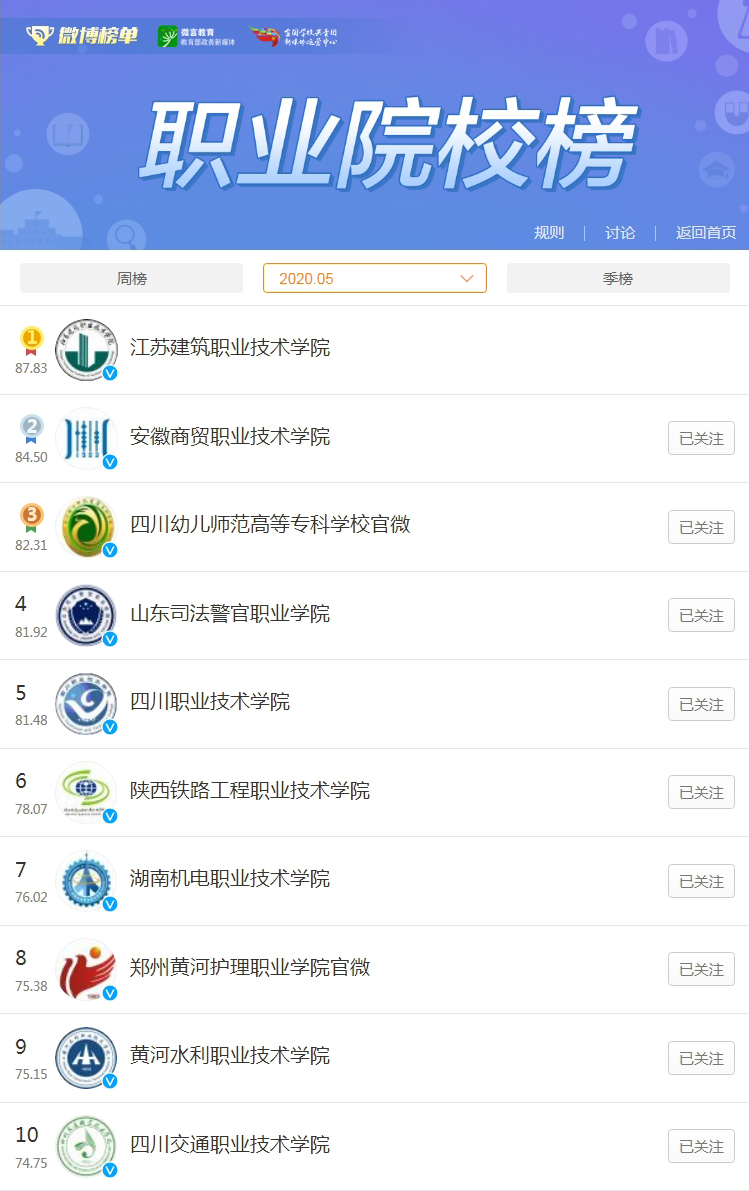 近日,教育部政务新媒体“微言教育”、全国高校共青团新媒体运营中心联合发布“微博校园榜”职业院校5月份月榜,纽约国际官网官方新浪微博以87.83的综合得分荣登榜首。数据显示,5月期间,官方微博共获总阅读量193万次、总“转评赞”2.58万次。