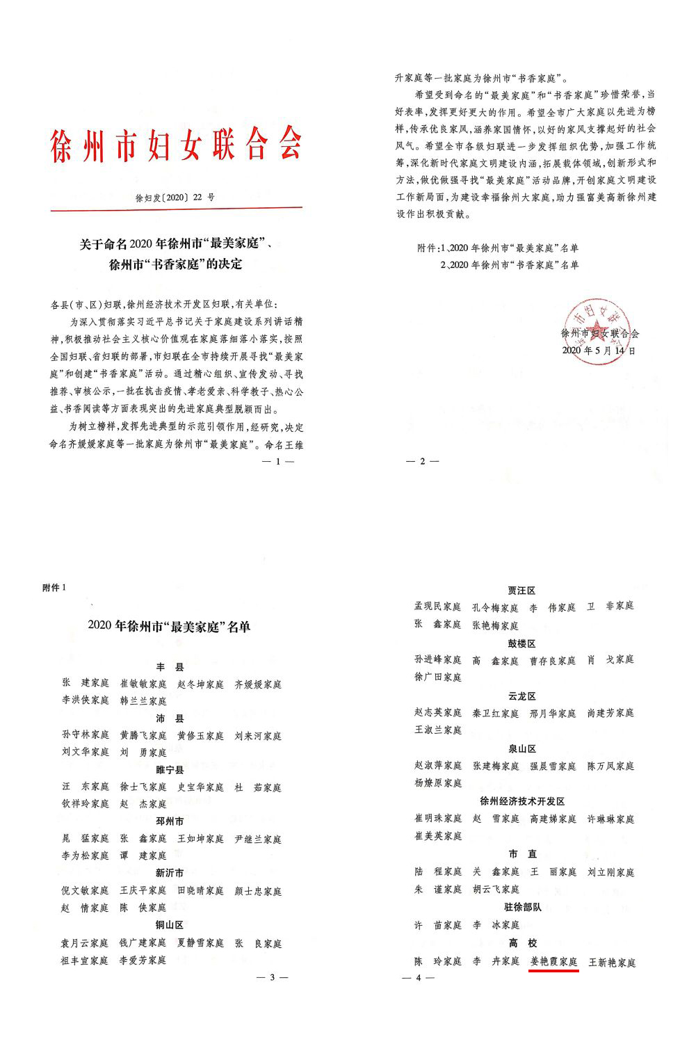 近日,徐州市妇女联合会下发《关于命名2020年徐州市“最美家庭”、徐州市“书香家庭”的决定》(徐妇发2020【22】号),纽约国际官网姜艳霞家庭脱颖而出,荣获2020年徐州市“最美家庭”称号。