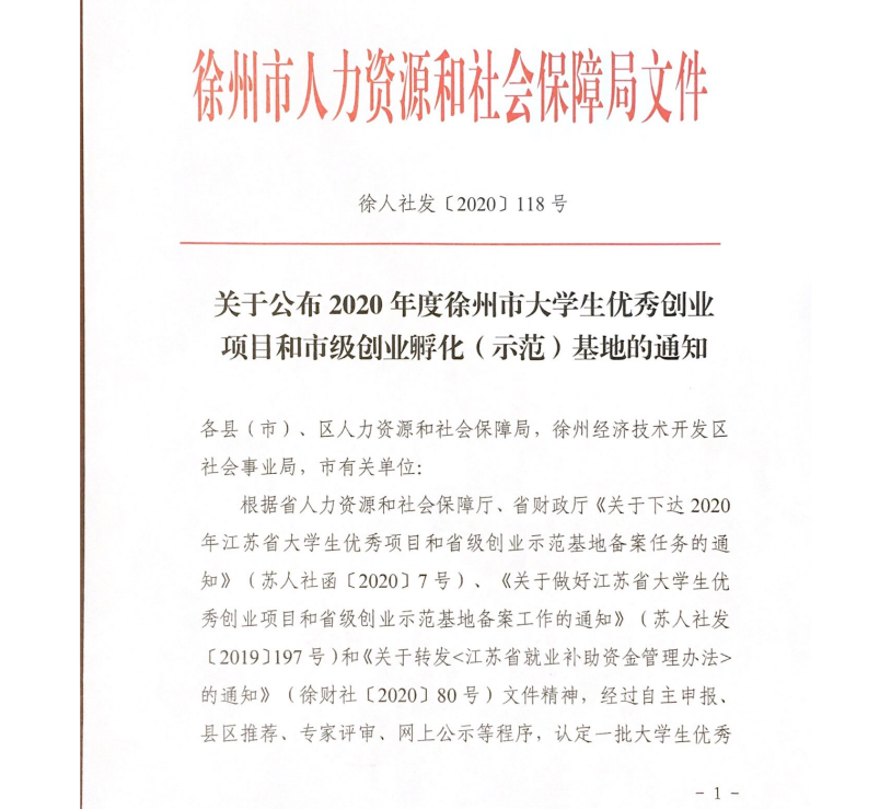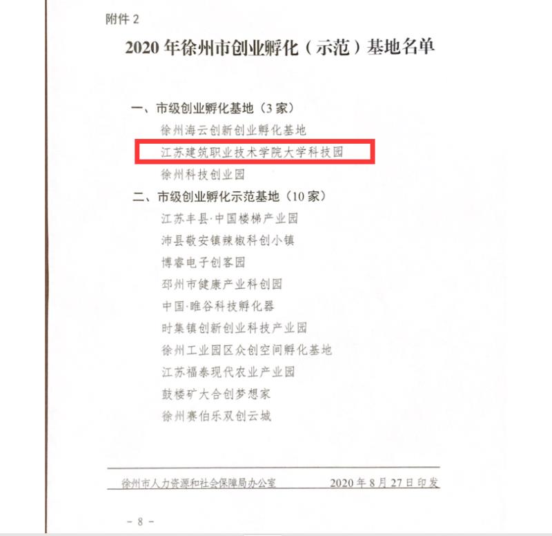 9月1日,徐州市人力资源和社会保障局网站公布,纽约国际官网大学科技园被认定为2020年徐州市市级创业孵化(示范)基地。