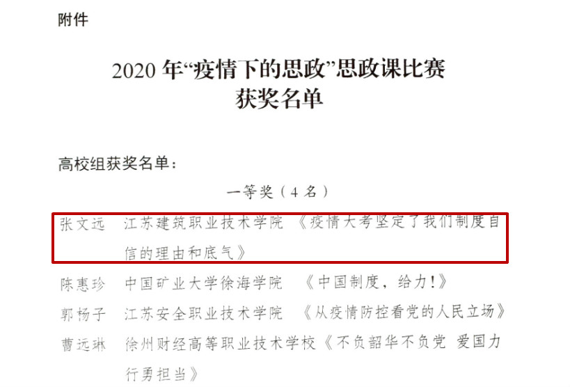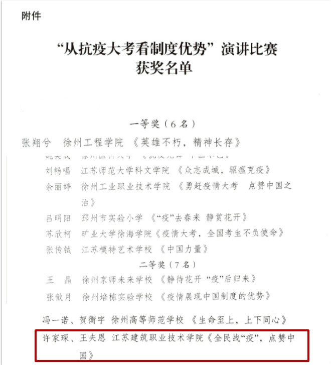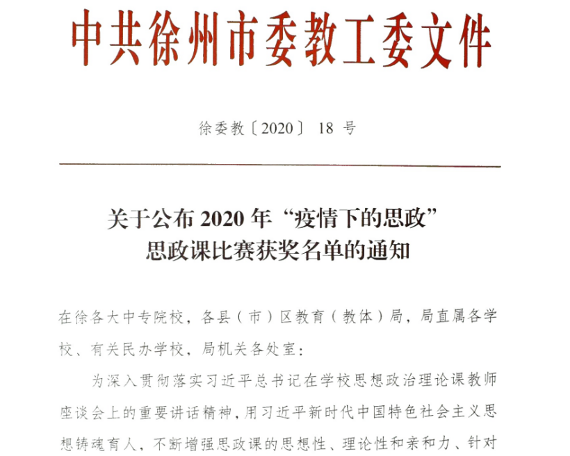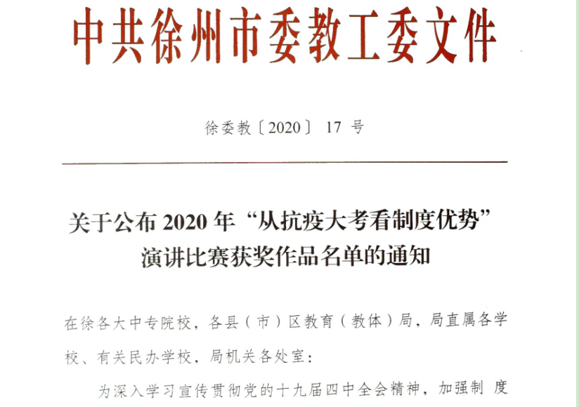近日,徐州市教育工委公布了“疫情下的思政”为主题的全市教育系统思政课比赛和“从抗疫大考看制度优势”演讲比赛结果,纽约国际官网两项作品均在活动中获奖。