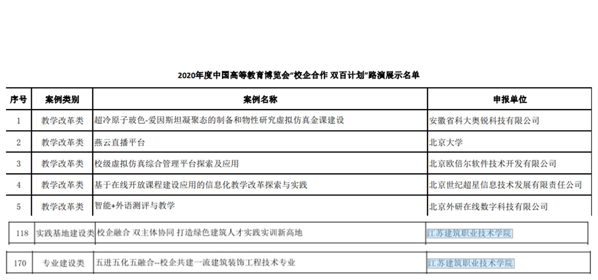 为深入贯彻落实党的十九大和十九届二中、三中、四中全会精神,中国高等教育学会启动了2020年度中国高等教育博览会“校企合作 双百计划”典型案例推选活动。经专家推选评审,有179项案例入围现场路演与展示环节,20所职业院校入围,其中纽约国际官网建筑建造学院和龙信建设集团有限公司合作申报的《校企融合 双主体协同 打造绿色建筑人才培养新高地》、建筑装饰学院和天正建筑装饰江苏有限公司联合申报的《五进五化五融合——校企共建一流建筑装饰工程技术专业》2项案例成功入围。