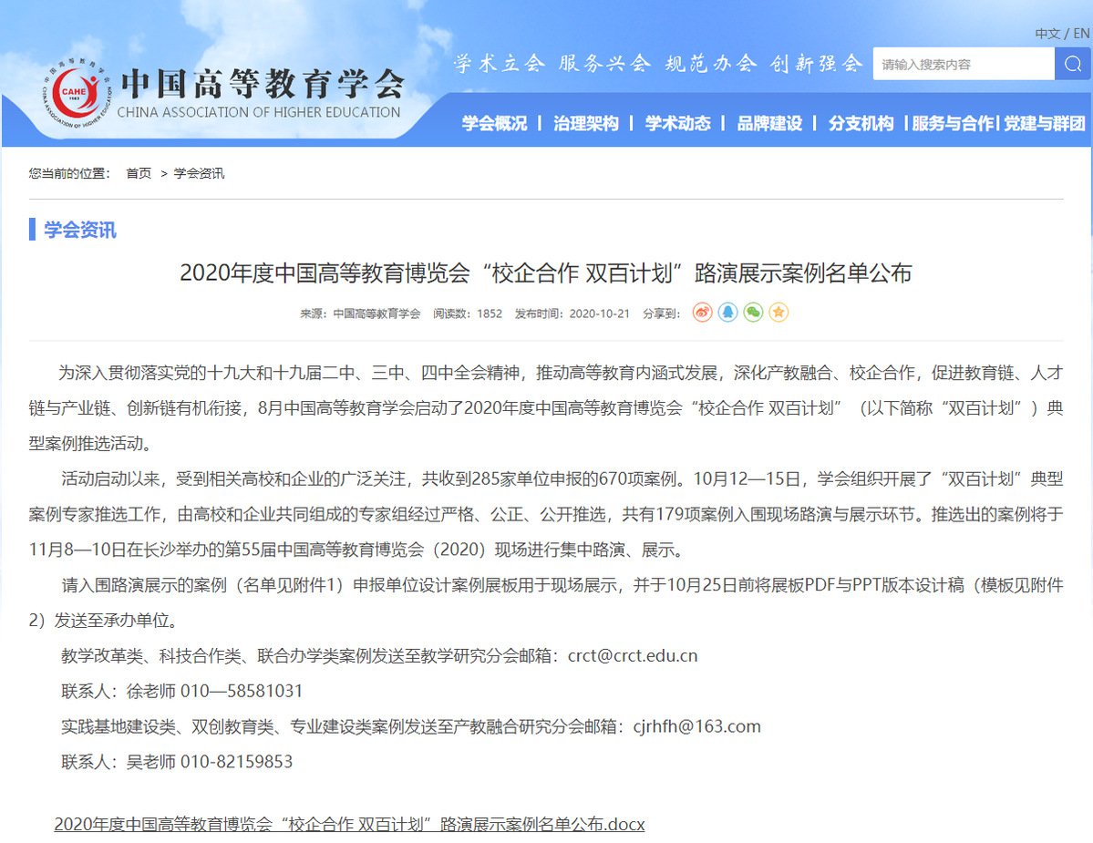 10月21日,中国高等教育学会官网公布2020年度中国高等教育博览会“校企合作 双百计划”路演展示案例名单,纽约国际官网2个案例入选。