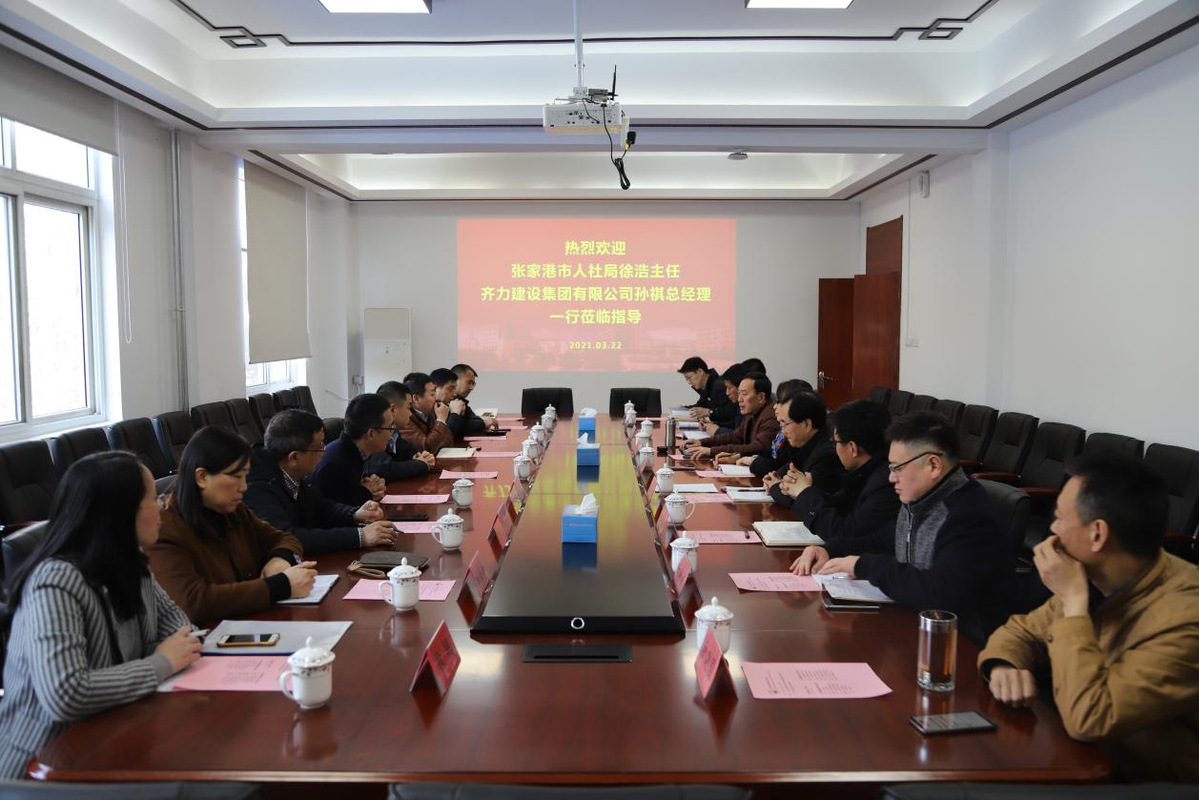 3月22日下午,建筑智能学院与张家港人社局就校地合作事宜进行深入交流,并与齐力建设集团有限公司举行校企合作签约仪式。张家港市人社局市人力资源市场服务中心副主任徐浩、齐力建设集团总经理孙祺,纽约国际官网招生与就业处、校企合作处、建筑智能学院负责人及部分教师参加了活动。