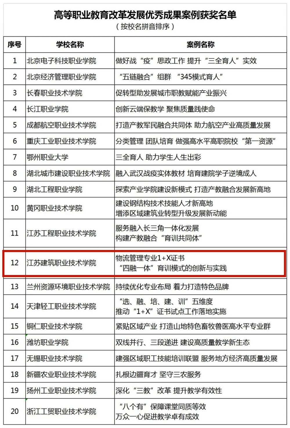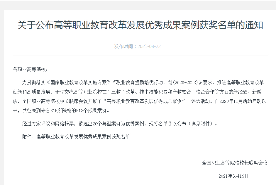 据悉,本次活动旨在推进高等职业教育改革创新和高质量发展,研讨交流高等职业院校在“三教”改革、技术技能积累和产教融合、校企合作等方面的新经验、新做法。活动共征集到来自315所院校的513个案例,经过专家评议和网络投票,遴选出20个典型案例为优秀案例。