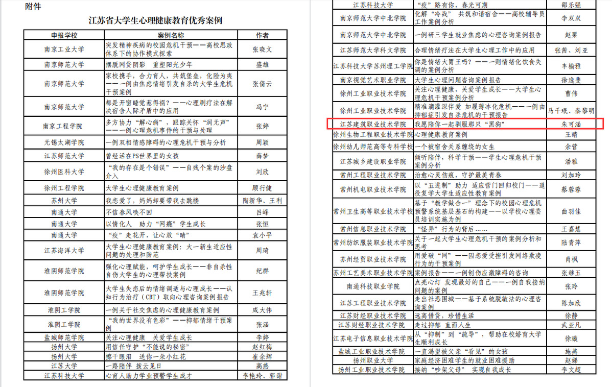近日,从江苏省教育厅获悉,在省教育厅高校学生处与教育宣传中心联合开展的“全省高校大学生心理健康教育优秀案例征集”活动中,纽约国际官网朱可涵老师提交的关于抑郁症干预的案例——《我愿陪你一起驯服那只“黑狗”》脱颖而出,被评选为“江苏省大学生心理健康教育优秀案例”。
