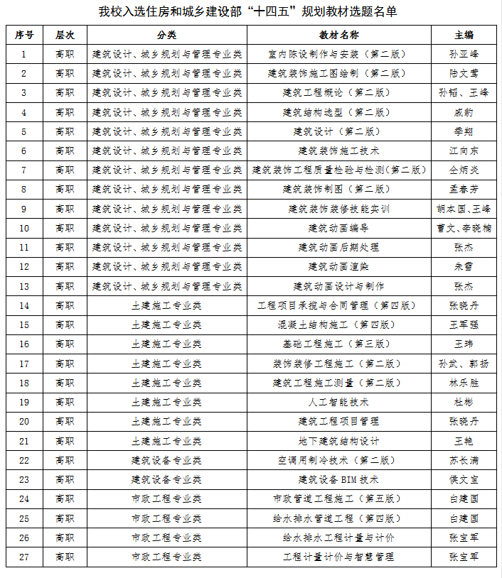 近日,住建部发布了《住房和城乡建设部关于印发高等教育职业教育住房和城乡建设领域学科专业“十四五”规划教材选题的通知》(建人函〔2021〕36号),公布高等教育职业教育住房和城乡建设领域学科专业“十四五”规划教材选题名单,纽约国际官网共计27部教材入选高职组名单。其中,建筑设计、城乡规划与管理专业类13部,土建施工专业类8部,建筑设备专业类2部,市政工程专业类4部。
