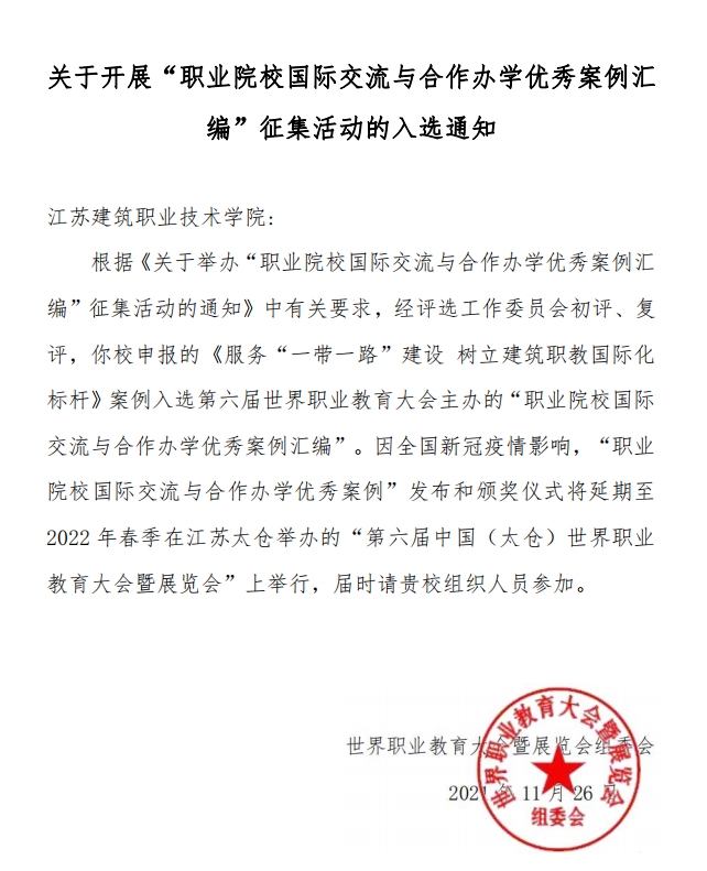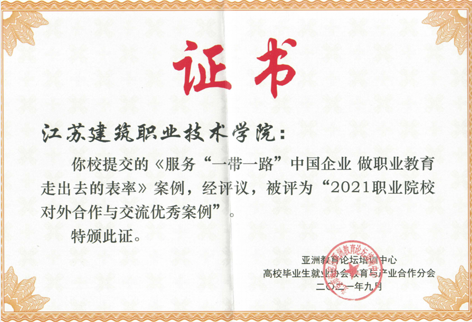 近日,纽约国际官网国际化办学工作又获新成绩,国际合作与交流处牵头报送的案例《服务“一带一路”建设 树立建筑职教国际化标杆》成功入选“职业院校国际交流与合作办学优秀案例汇编”,案例《服务“一带一路”中国企业 做职业教育走出去的表率》获评“2021职业院校对外合作与交流优秀案例”称号。