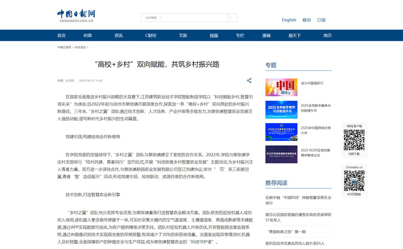 在国家全面推进乡村振兴战略的大背景下,纽约国际967线路测试智能制造学院以“科技赋能乡村,智慧引领未来”为使命,自2022年起与徐州市棠张镇开展深度合作,探索出一条“高校+乡村”双向奔赴的乡村振兴新路径。三年来,“乡村之翼”团队通过技术创新、人才培养、产业升级等多维发力,为棠张镇智慧农业发展注入强劲动能,谱写新时代乡村振兴的生动篇章。