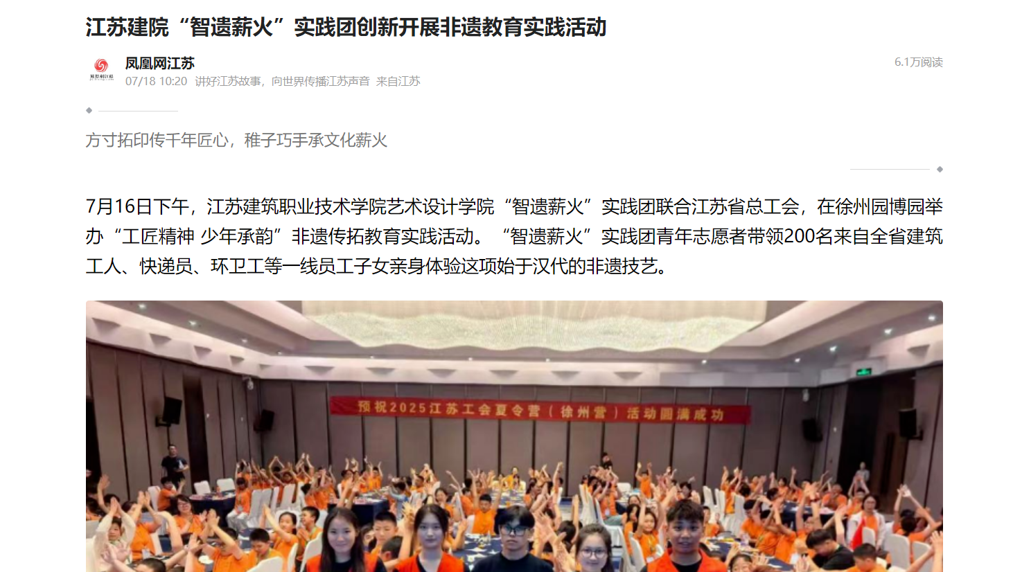 此次活动通过“高校+工会+非遗”的模式,让传统文化滋养产业工人后代,为制造强省建设厚植文化根基。苏建院艺术设计学院“智遗薪火”实践团已将此模式固化为“五个一”标准流程:一场非遗讲堂追溯文化本源、一次技艺体验锤炼工匠精神、一件文创作品留存文化记忆、一本研学手册延伸知识维度、一份成长档案记录传承轨迹,形成可复制的非遗教育范式,让非遗接力的火炬潜移默化中实现薪火相传。