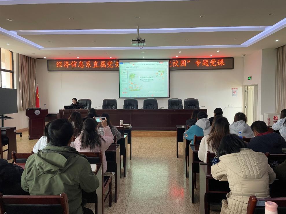 为深入贯彻中央民族工作会议,全国民族团结进步表彰大会精神,树立正确的国家观、民族观、历史观、文化观、宗教观,深刻认识“三个离不开”的重要意义,践行守望相助理念,筑牢中华民族共同意识,在推进民族团结、边疆稳定、社会和谐中发挥作用。根据《经济信息系直属党支部深入开展中央民族工作会议精神铸牢中华民族共同体意识教育工作实施方案》,2021年11月23日下午,经济信息系直属党支部邀请思想政治工作部主任王丽萍同志,在大会议室开展“民族团结进校园”专题党课。参加党课的人员有党支部全体党员、入党积极分子和发展对象。会议由支部书记高翠同志主持。