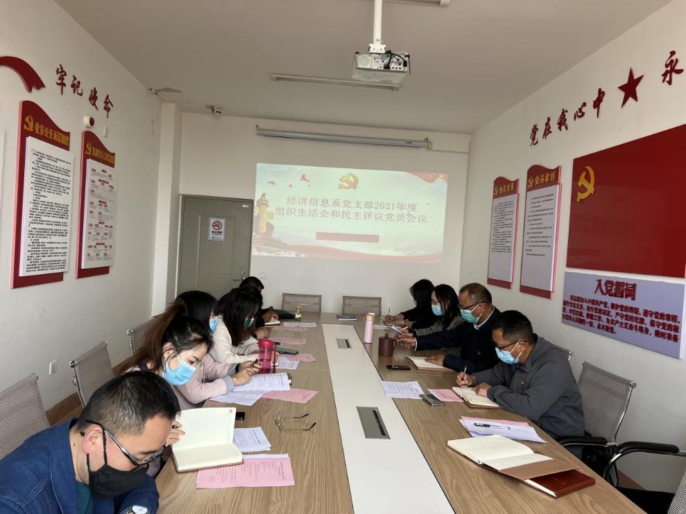 2022年3月18日中午,经济信息系党支部在诵弦楼6楼小会议室召开经济信息系党支部2021年度组织生活会暨民主评议党员。会议由支部书记高翠主持,学院党委书记孙继先列席会议。
