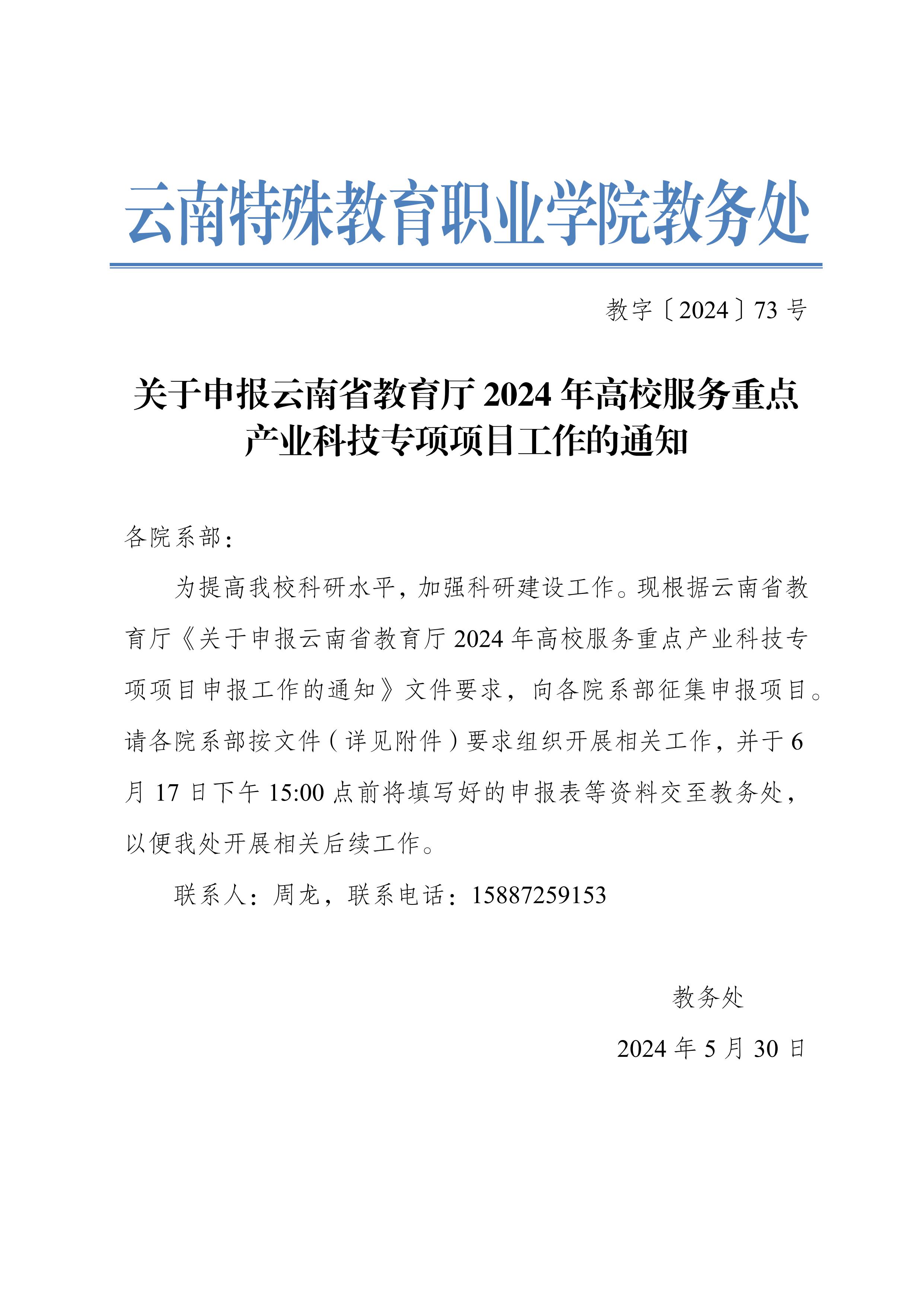 关于申报云南省教育厅开展2024年度云南省高校服务重点产业科技专项项目申报工作的通知