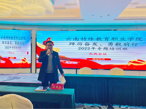专题培训班在庄严的国歌声中拉开序幕,学院党委副书记石安银同志在开班致辞中指出,学院优秀年轻后备干部及党员到扎西进行专题培训,旨在深入学习贯彻党的二十大精神及习近平总书记在中青年干部培训班上的重要讲话精神。对干部尤其是年轻干部要提高"七种能力"——政治能力、调查研究能力、科学决策能力、改革攻坚能力、应急处突能力、群众工作能力、抓落实能力。为年轻干部成长成才、更好肩负起新时代的职责使命指明努力方向。