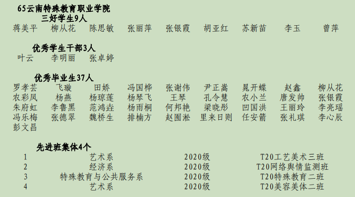 根据《中共云南省委教育工委、云南省教育厅关于公布2021-2022学年高校省级三好学生、优秀学生干部、先进班集体及大中专优秀毕业生名单的通知》。我院9名学生荣获省级三好学生、3名学生荣获省级优秀学生干部、37名学生荣获省级优秀毕业生;4个班级荣获先进班集体。