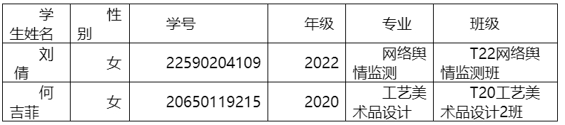 依据学生所属学院审查、教务处复核、校长办公会审议,决定给予刘倩、何吉菲同学退学处理。