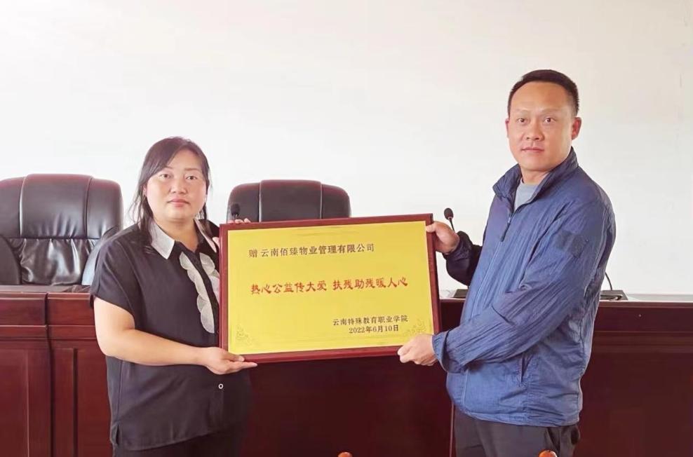 2022年6月10日下午,学生处在我院诵弦楼614室举行了云南佰臻物业管理有限公司助学金的捐赠仪式,云南佰臻物业管理有限公司总经理白继英、公司驻点经理李洪仁、办公室主任王秀云、我院学生处处长朱云佳、学生处副处长罗宝艳出席了此次活动。本次捐赠仪式由云南佰臻物业管理有限公司向我院捐赠助学金共20000元,资助残疾学生共10人。