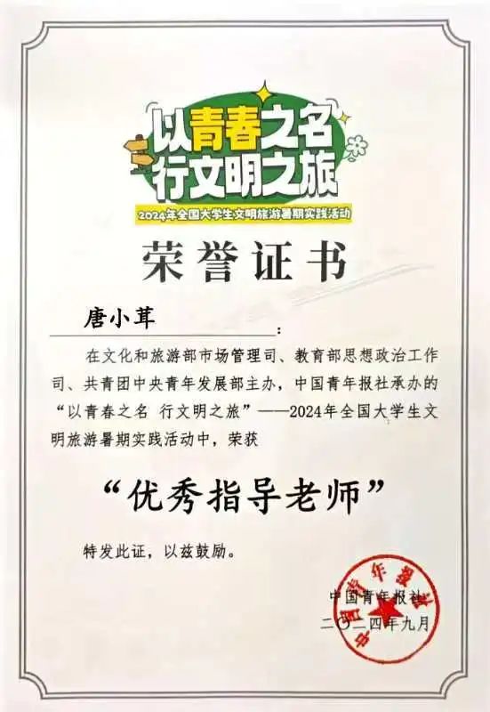 2024年9月,在文化和旅游部市场管理司、教育部思想政治工作司、共青团中央青年发展部主办,中国青年报社承办的“以青春之名 行文明之旅”--2024年全国大学生文明旅游暑期实践活动中,荣获“优秀指导老师”称号;