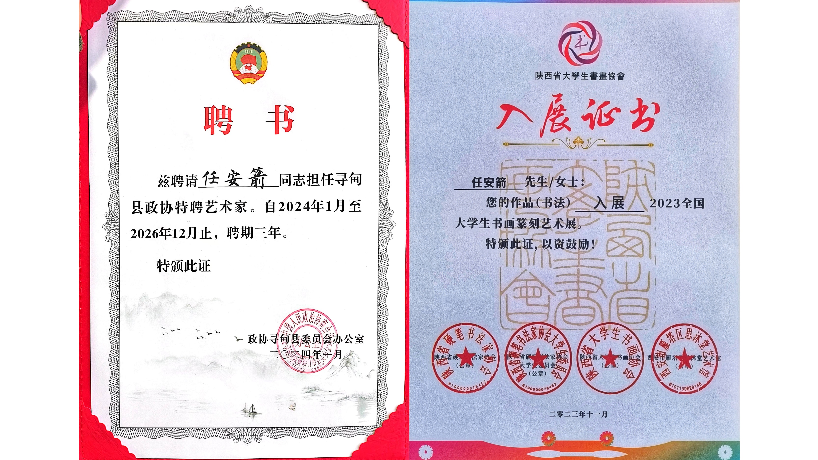 2022-2024年对他来说,是收获的年份,多年的坚持和努力付出,都在这一年开始回报。2022年他通过了云南省硬笔书法协会的测试,取得了入会资格,还获得了中华经典诵写讲大赛“笔墨中国”汉字书写大赛的省赛二等奖和国赛三等奖,在第八届“西湖之春”全国青少年书法大赛中获得了银奖。2024年他还获得2024年度云南省“最美大学生”称号;“云南省级优秀学生干部”等荣誉称号。2023年首届职规大赛在校内启动,在备赛期间,任安箭同学得到了指导老师郜锐的悉心指导和鼓励,同时也得到了系部和学校的大力支持。经过校内的层层选拔,任安箭和其他几位优秀的队友一起进入了云南省分赛区的比赛,并取得了省赛金奖的优异成绩,成功晋级全国总决赛。