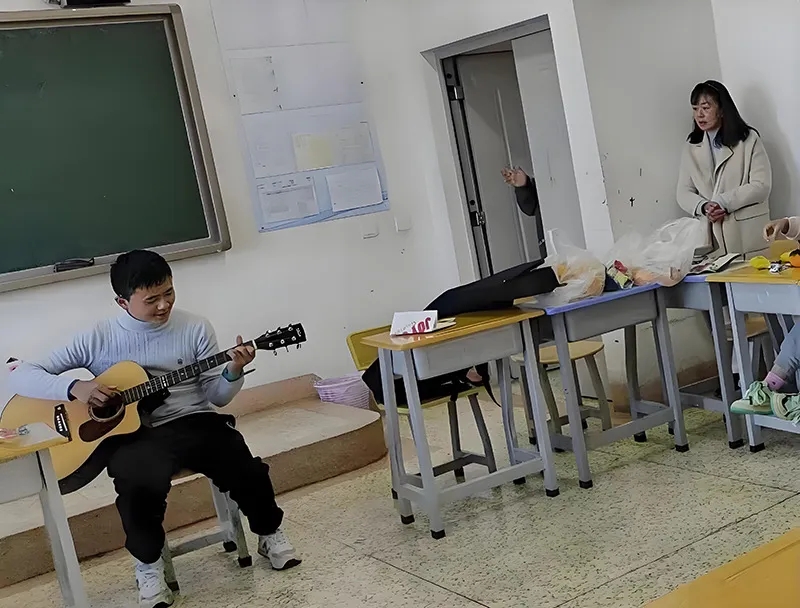 去年辰辰生日,他为全班同学表演吉他弹唱。受访者供图