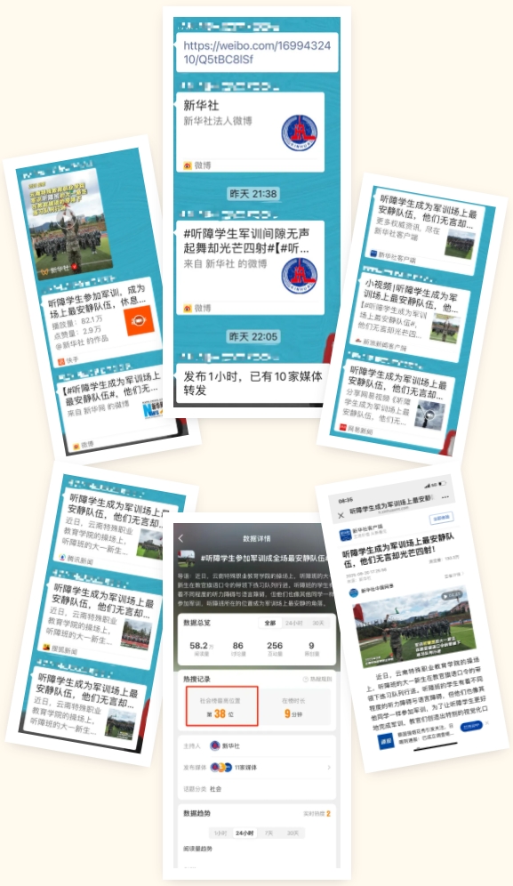 新闻发出后,今日头条、腾讯、新浪、搜狐、网易、快手等十余家媒体纷纷转发。当晚新华社热搜榜一度冲至第38位。截止到21号上午,新华社客户端浏览量突破百万,快手播放量也有82万、获点赞4.7万。BEAT365军训场上“最安静”的训练队伍,备受关注!