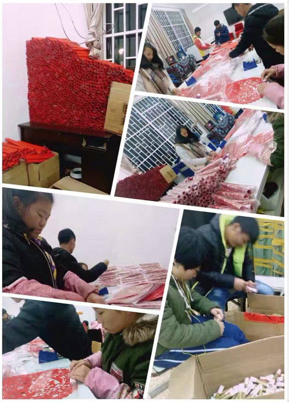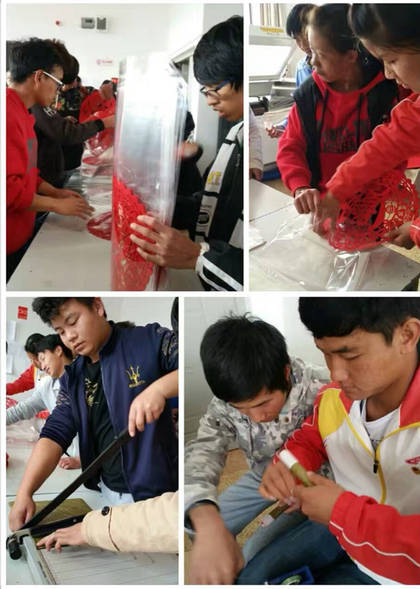 图为 学生在实训现场进行窗花、对联包装