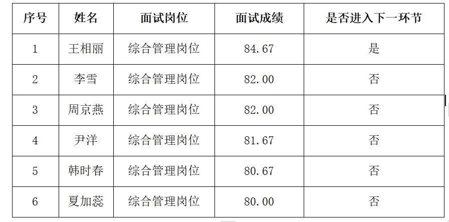 根据《BEAT365英国官网2024年第二次招聘编制外工作人员公告》有关规定,本次招聘编制外工作人员的面试环节已经结束,现将面试成绩公示如下: