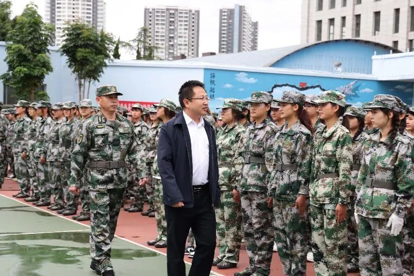 校长董亮在学校武装部王相智的陪同下检阅了2023级全体参训学生。2023级全体学生气宇轩昂、英姿勃发,以响亮的口号、严明的纪律、过硬的素质接受检阅。