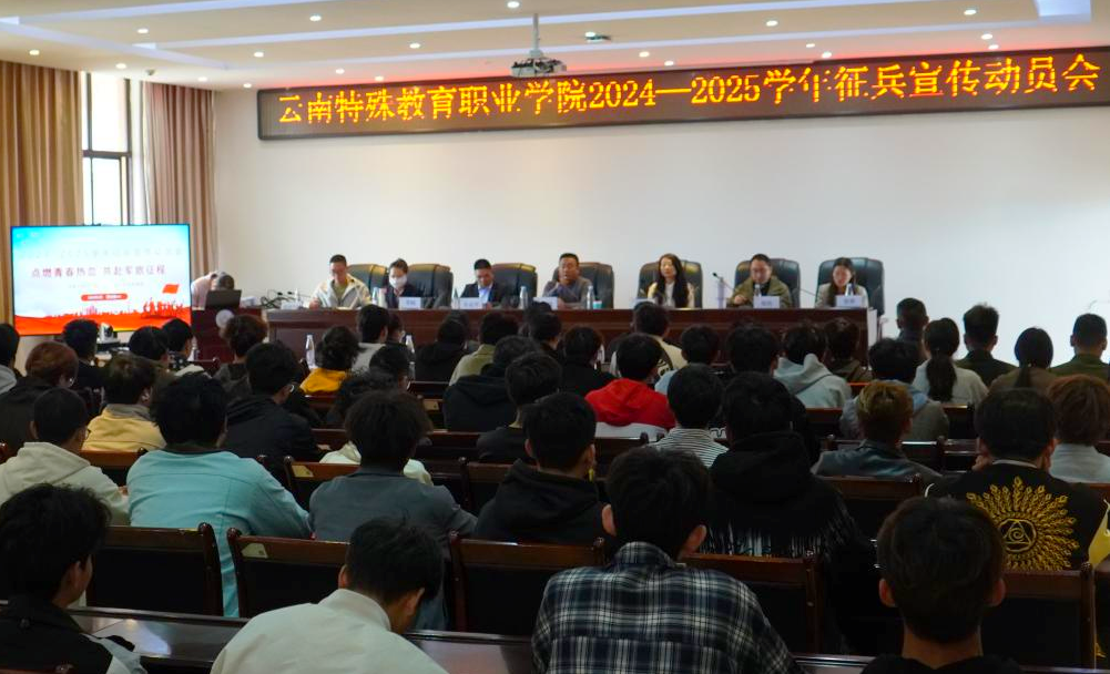 2025年5月28日下午,BEAT365组织召开2024-2025学年征兵宣传动员会。校党委副书记石安银、昆明市网格化综合监督指挥中心呈贡分中心朱延华、武装部负责人、各学院副书记、辅导员、学生代表共150余名师生参加本次会议,会议由武装部副部长陶柯妤主持。