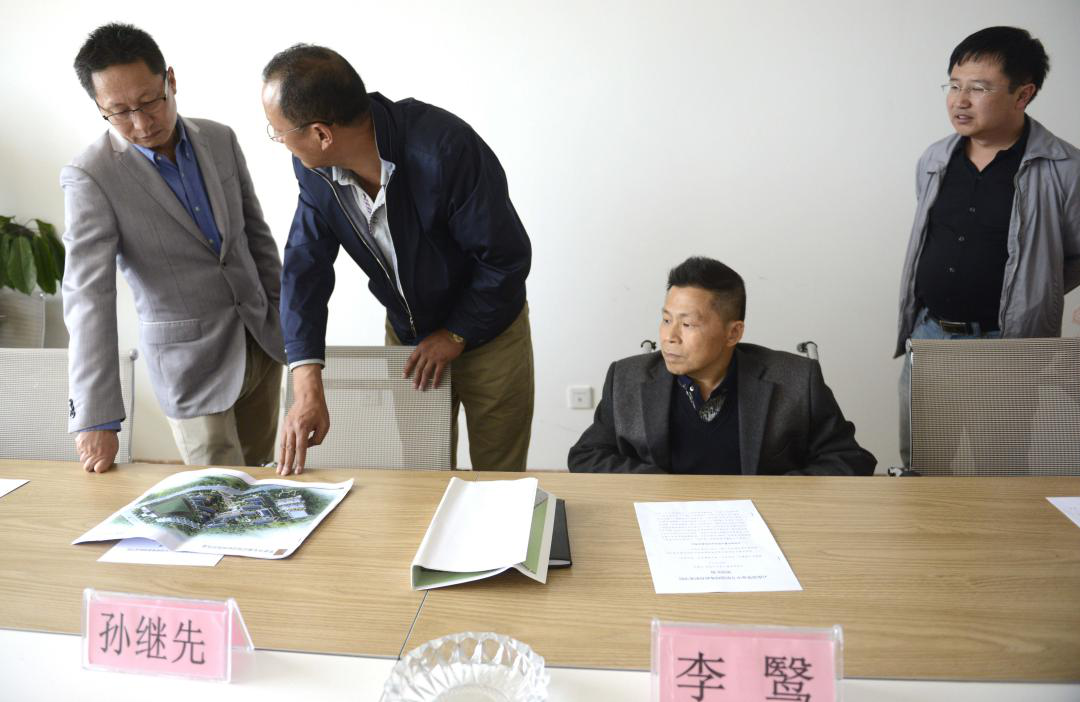 图为孙继先校长向邱林处长介绍新校区规划建设情况