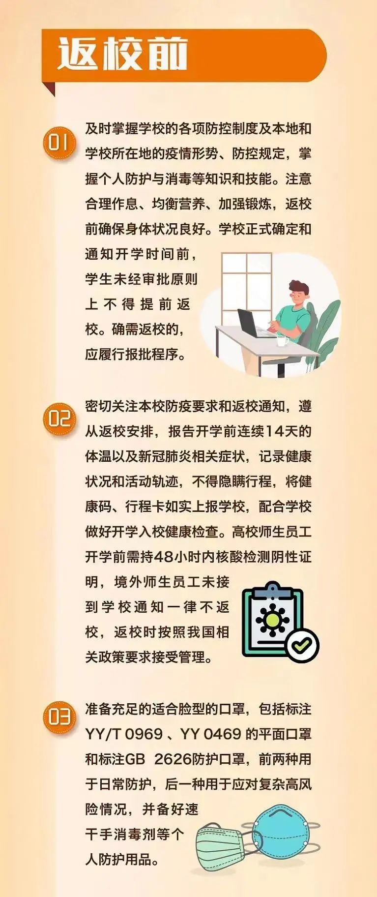 1、返校三周内科学佩戴口罩,在公共场所保持安全距离,保持良好的卫生习惯及健康的生活方式,做好日常防护工作。