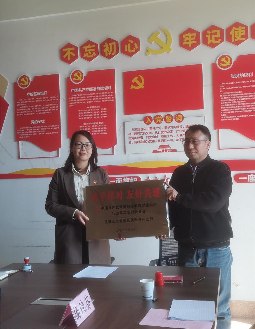 2022年10月19日下午,中共BEAT365英国官网行政二支部与民革云南省委直属科技一支部在BEAT365英国官网内开展联合共建活动,主要任务是通过支部共建,相互促进、友好合作、资源共享,充分发挥双方扶残助残的社会服务职能,为云南的特殊教育高等教育事业谱写更华丽的篇章。